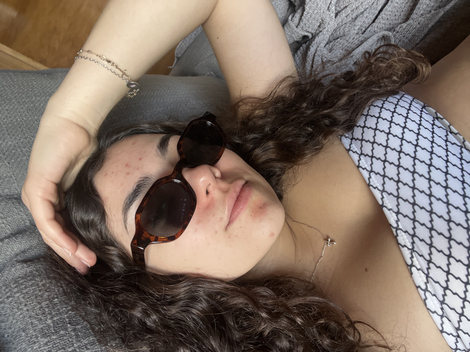 A young woman with curly brown hair rests on a gray, textured surface. She wears sunglasses perched on her nose and a white bikini top with a black geometric pattern. A silver bracelet adorns her raised left arm, and a delicate necklace with a cross pendant is visible near her chest. Her skin shows some blemishes. The overall composition suggests a relaxed, casual pose.