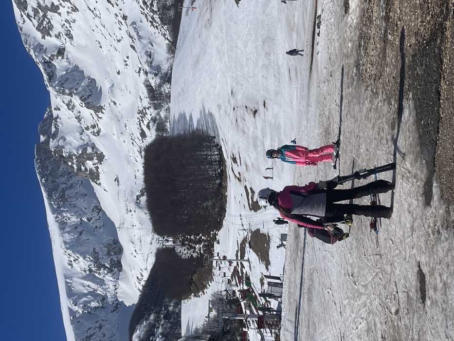 This image depicts a ski resort in Motički gaj, Montenegro, under a clear blue sky. Snow-covered mountain peaks dominate the background. In the foreground, an individual, seen from behind, wears a white helmet, a grey and pink jacket, and black ski pants, holding a pair of skis upright. Adjacent to this individual, a younger person wearing a white helmet, a light blue and pink ski jacket, and pink ski pants stands with skis attached, facing left. Both are positioned on a mottled surface of melting snow, ice, and exposed dark ground. Long shadows extend across the foreground from left to right. In the midground, a ski slope ascends, showing multiple ski tracks and varying snow coverage. Several other individuals are scattered across the slope. To the left, a multi-chair ski lift system with red chairs is visible, ascending the mountain. A dense cluster of dark, bare trees stands prominently on the slope in the mid-left.