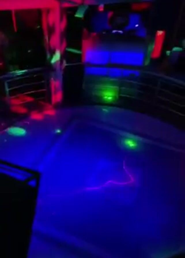 n interior shot of a multi-level dance club. The floor is illuminated with colorful changing lights, alternating between green, red, blue, and purple. There is a raised platform in the center of the dance floor featuring geometric patterns. Above, a DJ booth is visible with blue and white lighting. The camera angle is positioned above, looking down onto the dance floor. There are a few indistinct figures on the second level. A disco ball hangs from the ceiling, and red laser beams crisscross the space.