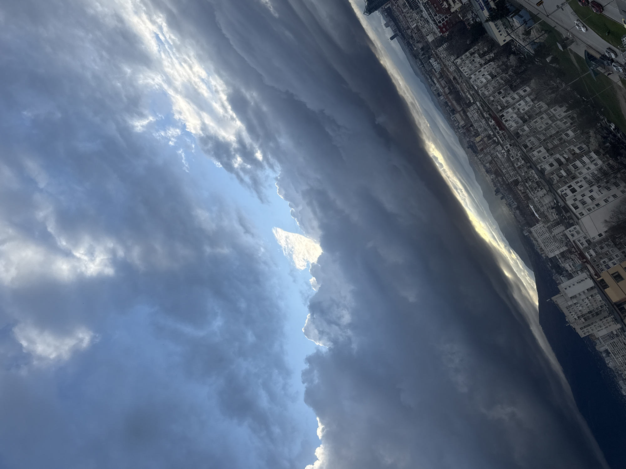 The image depicts a view of the sky dominated by dark, ominous storm clouds contrasted against patches of blue sky. A strip of urban landscape, identifiable as the city of Sofia, Bulgaria, is visible in the upper right corner. This includes buildings and streets, suggesting the scene is located within the city. The perspective is tilted, adding to the dramatic effect of the heavy clouds. The overall impression is one of a severe weather event approaching or receding.