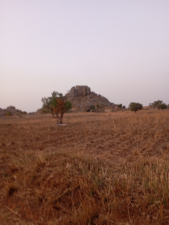 The image presents an arid, open landscape in Vom, Nigeria, under a pale, hazy sky. The foreground and midground consist of reddish-brown, dry soil with sparse patches of light brown, desiccated grass. A single deciduous tree, exhibiting sparse green and reddish-brown foliage, stands in the midground, with a white object visible at its base. In the background, a large, grey-brown rock formation or hill dominates the horizon, featuring a distinctive, vertically split boulder at its summit. Smaller trees are scattered around the base of this formation and in the distant midground to the right. No human figures or discernible structures are present.