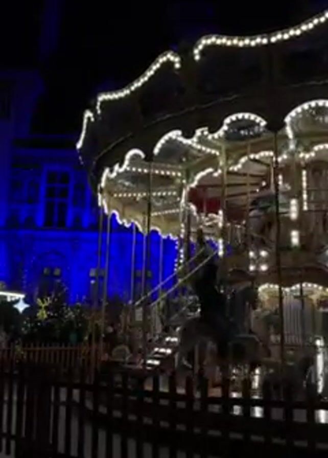 At night, a two-tiered carousel spins, brightly lit with white lights. Several people ride the carousel's horses. The carousel is surrounded by a wooden fence. In the background, a large building is illuminated with blue light. A small Christmas tree is visible. The video is stable and taken at eye level.