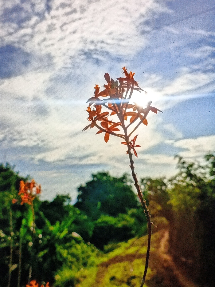 The image displays an outdoor scene, likely a natural or rural area within the city of Unknown, Unknown. The central subject is a tall, slender stem adorned with multiple small, vibrant orange flowers, depicted in sharp focus against a bright sky. Sunlight directly behind the flower cluster creates a prominent lens flare and backlights the blooms. The upper two-thirds of the frame show a blue sky with scattered white and grey stratocumulus clouds. The lower third of the image is out of focus, revealing dense green foliage, including trees and other plants. A blurred dirt path or trail extends into the background on the right, disappearing into the distant vegetation. Another cluster of similar orange flowers is visible in the blurred mid-ground on the left. No individuals or man-made structures are discernible.