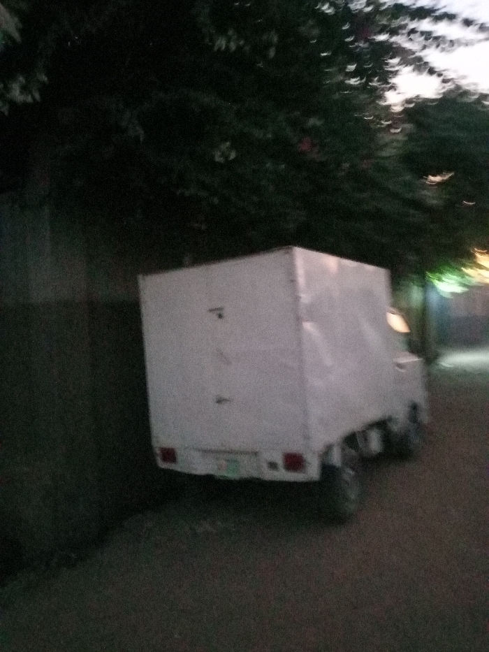 This low-light, blurry image depicts a white, light-duty box truck situated diagonally on a dark, unpaved surface in Gwagwarwa, Nigeria
