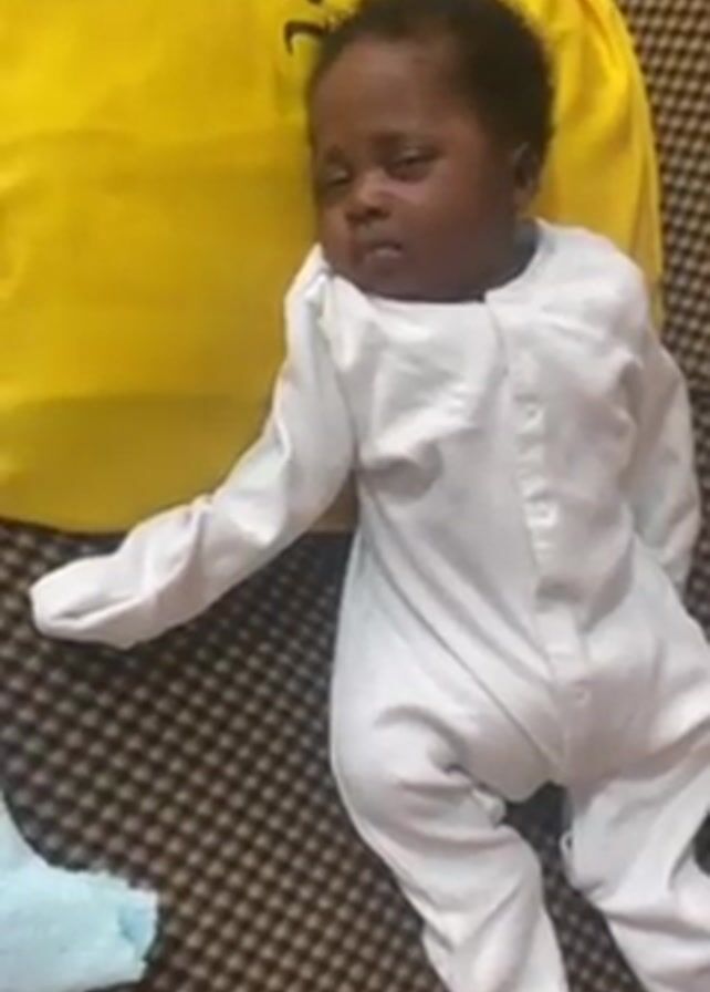 A baby in a white onesie lies on a brown and beige checkered surface next to a yellow pillow. The baby has dark skin and short black hair and looks towards the camera. A light blue cloth is also near the baby. There is audio of people talking in the background.