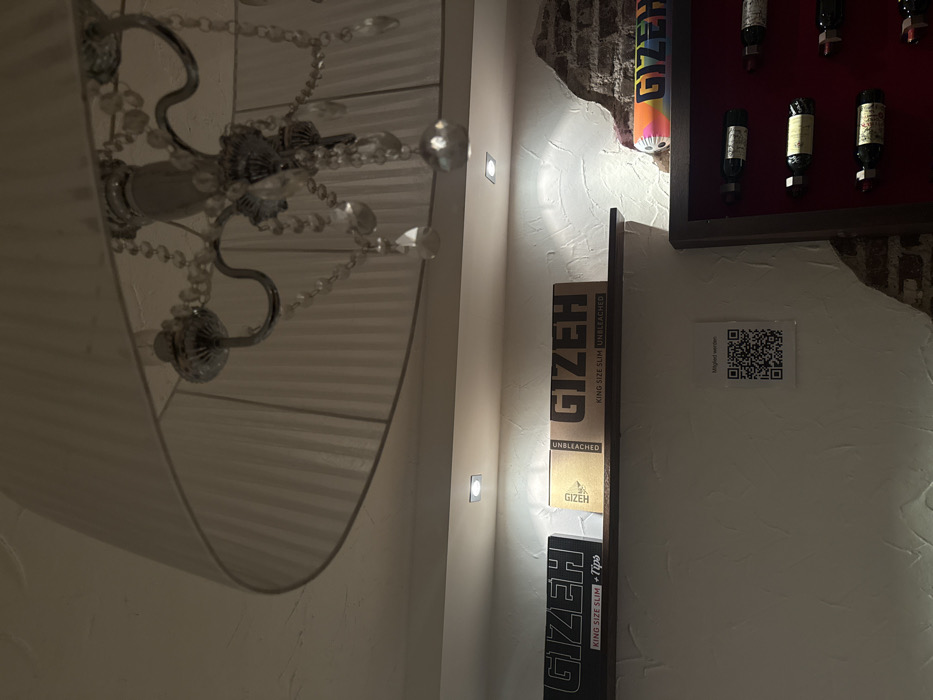 A chandelier hangs to the left of the frame, casting shadows on the wall. To the right, a display features bottles in a red-lined frame, with a Gizeh rolling paper display below. A QR code sits on the textured, off-white wall. Recessed lighting accents the wall's vertical space between the chandelier and the Gizeh display.