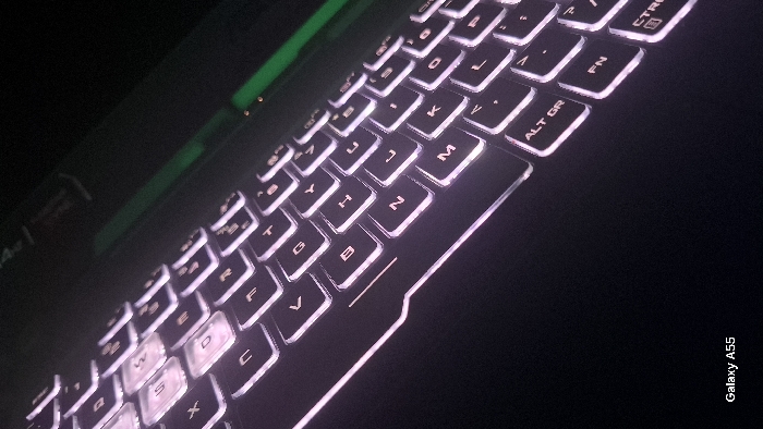 The image displays a close-up, oblique view of a backlit computer keyboard in a dark environment. The keyboard features black keys with illuminated characters and outlines, emitting a pale purple-white light. Keys visible include portions of the standard QWERTY layout, such as 'S', 'D', 'X', 'C', 'V', 'B', 'N', 'M', 'L', 'K', 'J', 'H', 'G', 'F', 'R', 'E', 'W', 'Q', along with modifier keys like 'Caps Lock', 'Shift', 'Ctrl', 'Fn', and 'Alt Gr'. A subtle green light source is visible along the upper edge of the device, possibly a power indicator or accent light on a laptop. The ambient lighting is minimal, consistent with an indoor setting at night or in a low-light room. No individuals, actions, or interactions are present in the frame. A "Galaxy A55" watermark is present in the lower-left corner. The specific geographical location, including the city of Veliki Preslav, Bulgaria, cannot be determined from the visual evidence provided.
