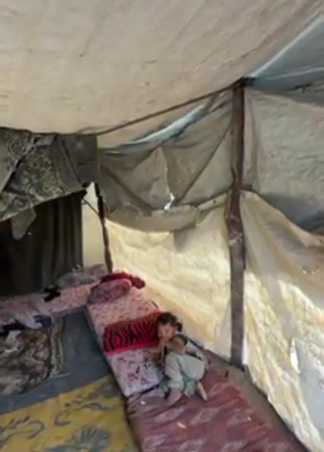 interior of a tent or makeshift shelter. The structure is constructed from wooden beams and draped with fabric or tarpaulin, which appears worn and patched with holes allowing sunlight to filter through. Inside, a young child is sitting on a mattress, which is covered with a red patterned fabric and a decorative pillow. The floor is covered with an yellow and brown patterned rug. To the left, there is another area that appears to be a sleeping space with piled blankets. The overall impression is one of sparse and humble living conditions.