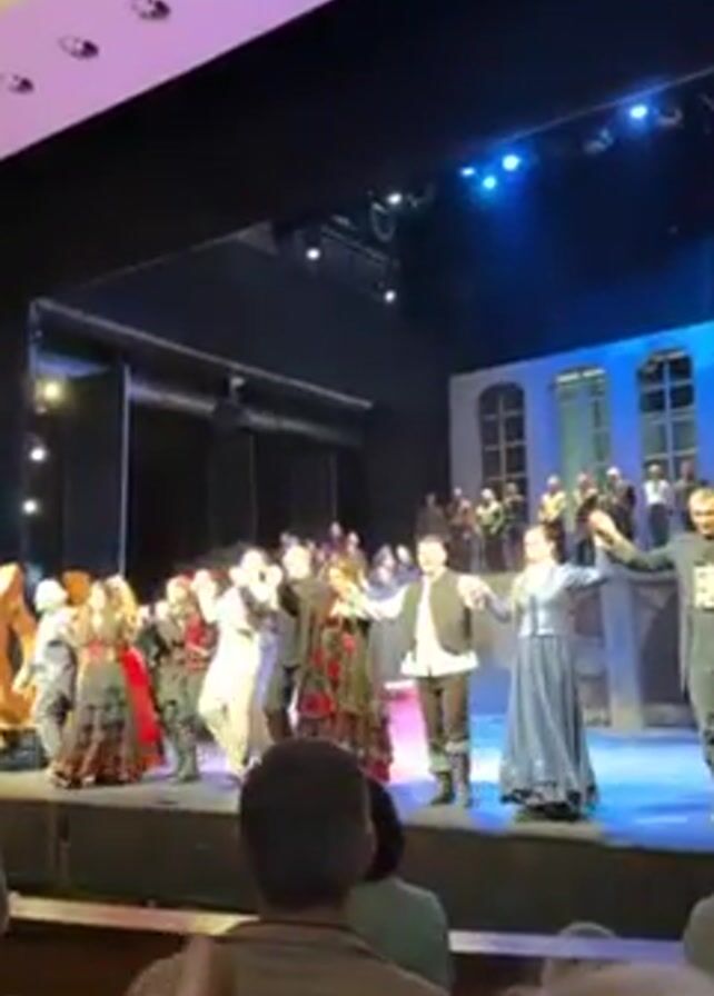 The video captures the cast of a theatrical performance receiving applause on stage. The actors, dressed in period costumes, stand in a line at the front of the stage, holding hands and bowing to the audience. The stage setting includes props and a backdrop that suggests a historical or fictional setting, featuring some buildings. The audience is visible in the foreground, clapping enthusiastically. Stage lighting is a mix of blue, red and white lights. The theater itself appears to be a small to medium-sized venue. The overall atmosphere is celebratory and appreciative.
