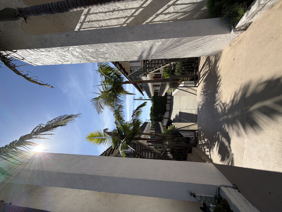 The image depicts an outdoor residential scene in Manhattan Beach, United States of America, under a clear blue sky with direct sunlight. The perspective is from within a passageway, framed by two thick, textured white stucco pillars or archways on the left and right foreground. A strong sun lens flare emanates from the upper left, casting distinct, elongated shadows of palm fronds across the light-colored paved ground. The scene opens into a courtyard or driveway flanked by two multi-story residential buildings with white stucco facades and brown-tiled roofs. Both buildings feature exterior black metal staircases leading to upper-floor balconies, also equipped with black metal railings. Numerous palm trees, varying in height and frond density, are strategically placed between the buildings and along the central pathway. In the midground, a dark metal gate system is visible on both sides, marking an entrance to a lower area. Green foliage, including various bushes and smaller plants, is present in planter boxes and garden beds bordering the buildings and gates. A green garden hose coiled around a spigot is attached to the lower left stucco wall. In the background, a paved driveway extends further into the complex, with a dark-colored vehicle partially visible on the left side, obscured by surrounding green hedges. Utility poles and overhead wires are faintly discernible against the distant sky. No individuals are present in the scene, and no overt actions or interactions are depicted.