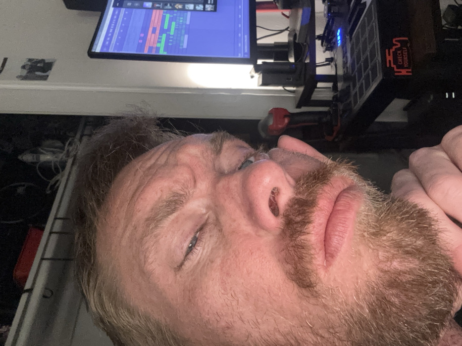 An adult male is captured in a close-up image within an indoor residential setting in Los Angeles, United States of America. The subject, a light-skinned individual with light brown, disheveled hair and a matching beard and mustache, occupies the majority of the frame. He looks directly at the camera with a squinting expression, characterized by a heavily wrinkled forehead and partially closed eyes, revealing the blue iris of his left eye (viewer's right). His lips are slightly pursed, and his right hand rests near his chin. The background consists of a cluttered personal space. To the upper left, a dark shelf contains a red rectangular object, an iron, and various cables. To the right, a dark desk or table supports electronic equipment. A computer monitor displays a multicolored digital audio workstation (DAW) interface. Below the monitor, a red and black handheld power drill stands upright next to a black audio interface. A black pad controller, consistent with a MIDI device, features a "CHECK YOURSELF" sticker resembling a check engine light below its grid of pads. A white vertical doorframe separates the subject from the monitor, with a small black-and-white photograph affixed to it. A bright light source illuminates the wall adjacent to the monitor.