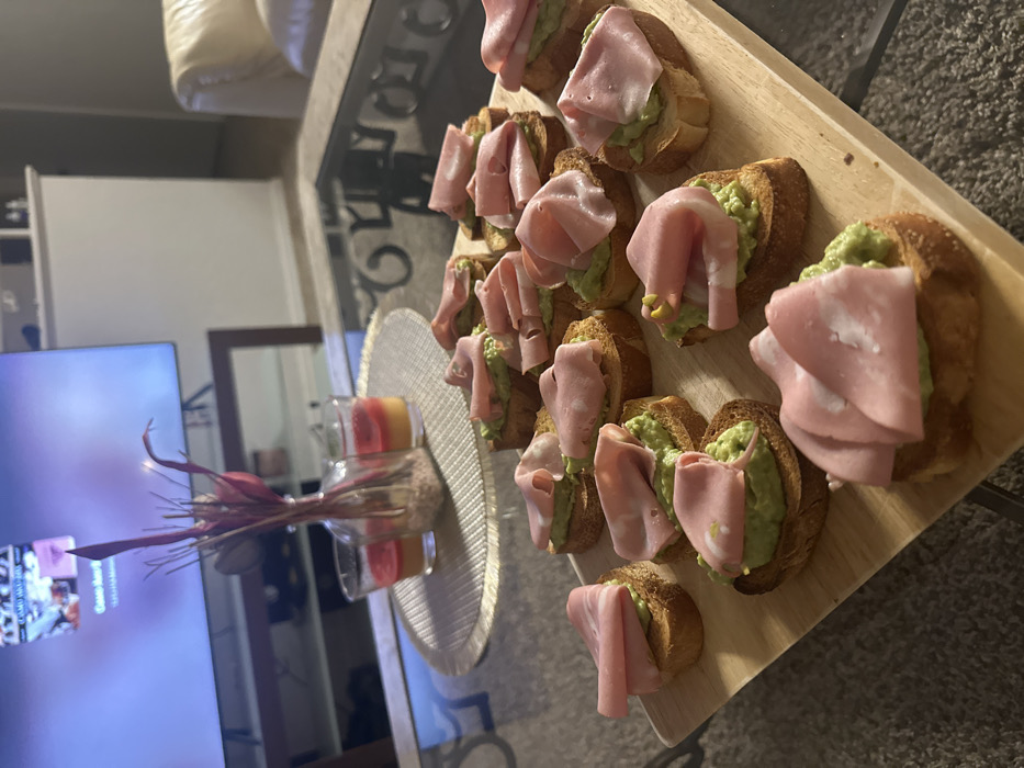 This image depicts an indoor domestic setting, likely a living room, within East Naples, United States of America. The primary subject is a wooden rectangular serving board positioned on a glass-top coffee table, displaying approximately 18-20 individual appetizers. Each appetizer consists of a toasted bread crostini topped with a green, mashed substance, likely avocado or guacamole, and a folded slice of light pink deli meat, consistent with mortadella. To the left of the serving board, on the glass table and atop a circular light grey placemat, are three decorative items: a clear glass bottle vase containing dried reddish-purple foliage, flanked by two clear glass votive candle holders. The candles contain layered liquids, one red and the other orange/yellow. In the blurred background, a large flat-screen television is visible, displaying indistinct content with a purple and white color scheme. The television rests on a dark brown rectangular console table. A light-colored, possibly cream or white, upholstered furniture piece, consistent with a sofa or armchair, is partially visible in the far right background. The floor is covered with light-colored carpeting. No individuals are visible in the scene. The lighting suggests an interior, possibly evening, ambiance.