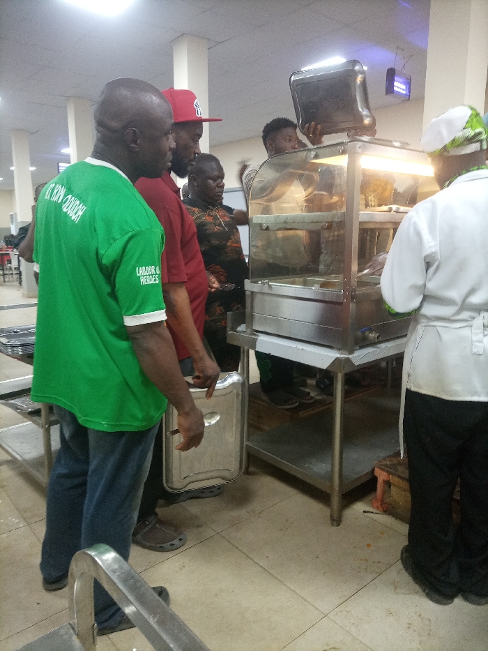 A group of people, presumably in a cafeteria setting, are gathered around a heated food display case