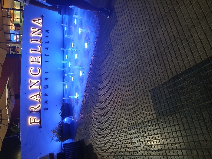 The scene depicts the illuminated exterior of a commercial establishment named "FRANCELINA" in Porlamar, Venezuela, during nighttime. A prominent, gold-illuminated sign displaying "FRANCELINA" in large capital letters and "SAPORI ITALIA" below it is affixed to a white wall. This wall is intensely back-lit with blue light, which also illuminates a rectangular, shallow water feature directly in front of it. The water feature contains multiple active vertical jets and is illuminated by blue submerged lights. Two dark potted plants with green foliage are positioned on the left side of the water feature, against the base of the wall. The immediate foreground consists of a dark-colored, square-tiled ground surface, appearing wet or reflective in certain areas. Partial views of two individuals are present: a person's upper torso in a white shirt is visible on the far left, and a person's lower legs and feet, wearing dark shorts and dark athletic shoes with white soles, are seen on the far right, positioned near the water feature. The background reveals blurred elements including large, light-colored patio umbrellas and illuminated interior spaces of a building.