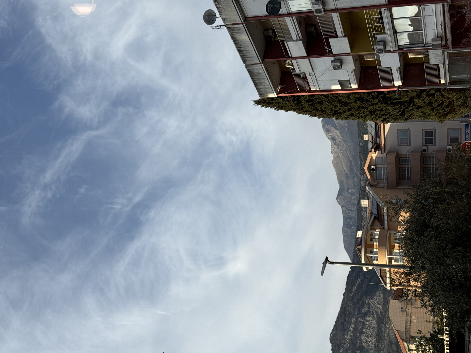 An urban scene in Budva, Montenegro, depicts a residential area with a mountainous backdrop under a partially cloudy, light blue sky. In the background, dark, rugged mountains stretch across the horizon, with sunlit peaks. The mid-ground features several multi-story residential buildings; one centrally located building is orange with a rounded facade and balconies. A tall, dark street light with a horizontal luminaire is positioned in front of this building. The foreground contains dark green shrubs. On the right, a tall, slender dark green cypress tree stands adjacent to a prominent multi-story residential building. This building has a flat, weathered concrete roof supporting two satellite dishes and multiple antennae. Its facade displays balconies with white railings, alternating dark red, yellow, and white wall sections, numerous air conditioning units, and roller shutters on windows. A "UNIQA" sign is partially visible at the base of this building. The scene is illuminated by strong daylight, casting shadows on the left sides of structures. No individuals are visible.