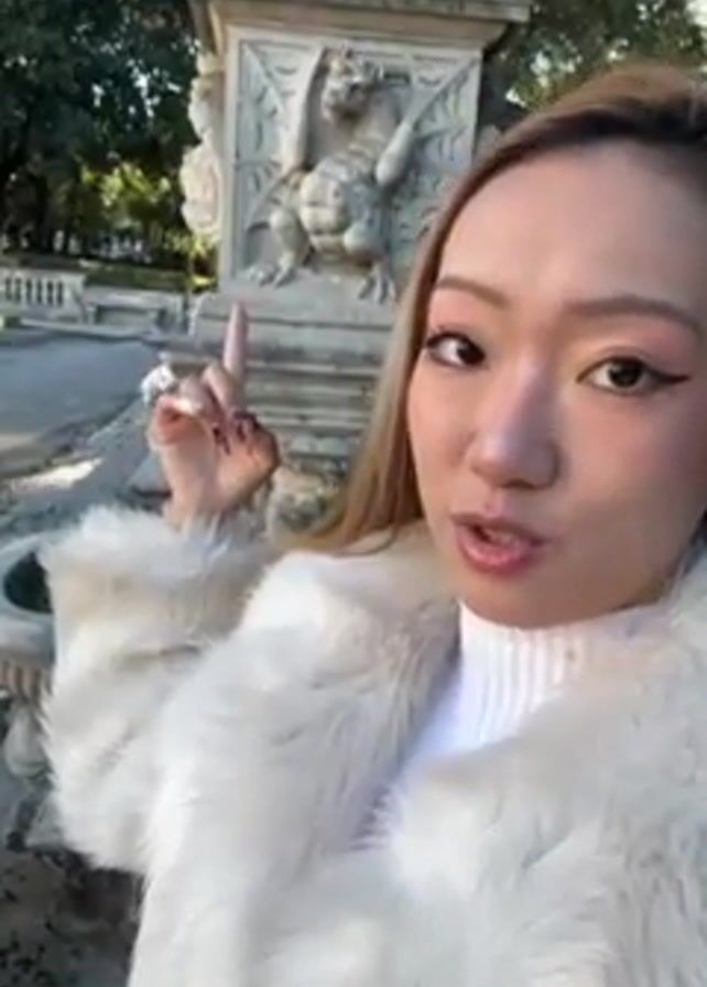 A fair-skinned woman with long blond hair is recording a video of herself outside in a park-like setting. She’s pointing up at a light-colored stone sculpture with a dragon on its side. The sculpture also functions as a water fountain. In the background, a woman wearing black pants and a white top is walking a light-colored dog. The background contains trees, grass, and concrete benches. The time of day appears to be daylight. The woman in the foreground is wearing a white faux-fur coat and white turtleneck.