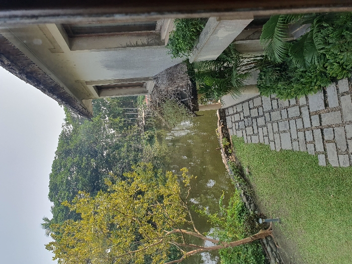 This image captures an outdoor scene at the Eco Park Resort in New Town, India, viewed from an elevated vantage point. On the right, a segment of a light-colored building wall is visible, featuring two vertical rectangular windows and a substantial thatched roof overhang. Beneath the main roof, a smaller thatched canopy extends over a supporting pillar. The building's base and a lower balcony are lined with dense green vegetation, including shrubs and small palm-like plants. An irregular pathway constructed from rectangular stone slabs diagonally traverses the foreground and midground, situated on a manicured green lawn. To the left of the path, a deciduous tree with light green-yellowish foliage and a visible trunk stands near the edge of a calm, reflective body of water, identifiable as a lake or large pond. A small, grey cylindrical garden light is positioned at the tree's base. The water's edge is delineated by a low, rough stone embankment. The background consists of dense, dark green trees and foliage. Across the water, partially obscured by distant trees, several light-colored, stilt-supported structures or platforms are faintly visible. The sky above is clear and appears light blue to white. No individuals or discernible actions are present in the scene.
