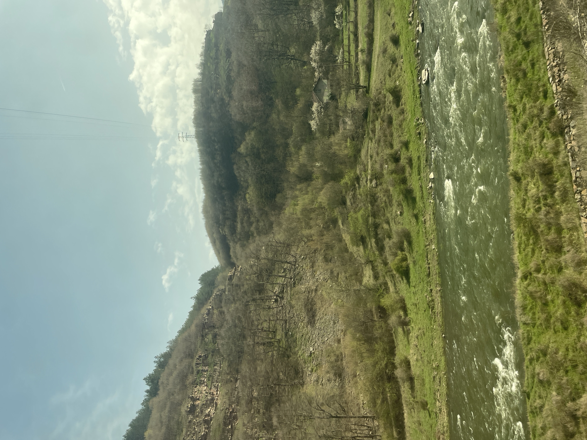 A slightly tilted, medium shot shows the Iskar River running through a rural scene near Tserovo, Bulgaria. The river dominates the right side of the image, its surface churning with white water rapids, flanked by green banks of grass and shrubs. On the left, a steep hillside covered with dense forest rises. The lower part of the hillside is more barren with exposed rock faces and leafless trees, transitioning into a denser, greener forest towards the top. In the distance, power lines stretch across the sky, supported by a tall metal tower. The sky is pale blue with scattered clouds. A small house is visible among the trees on the hillside.