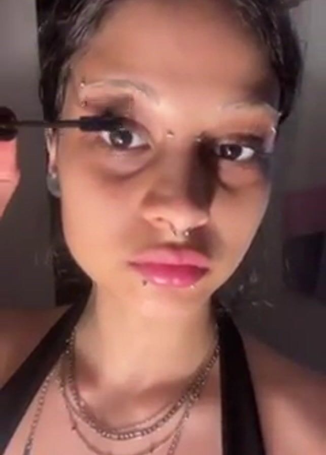 A close-up shot shows a young woman with multiple piercings (eyebrows, nose, lips) and stretched earlobes applying mascara to her eyelashes