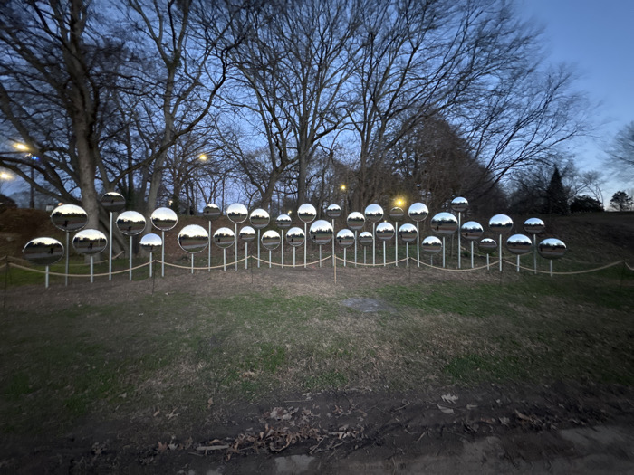 A unique art installation decorates a grassy slope under bare trees against a dusk sky. The installation features numerous round, reflective discs mounted on slender poles. These discs create a shimmering effect, mirroring the surrounding environment. A thin rope serves as a boundary. The scene evokes a blend of nature and modern art.