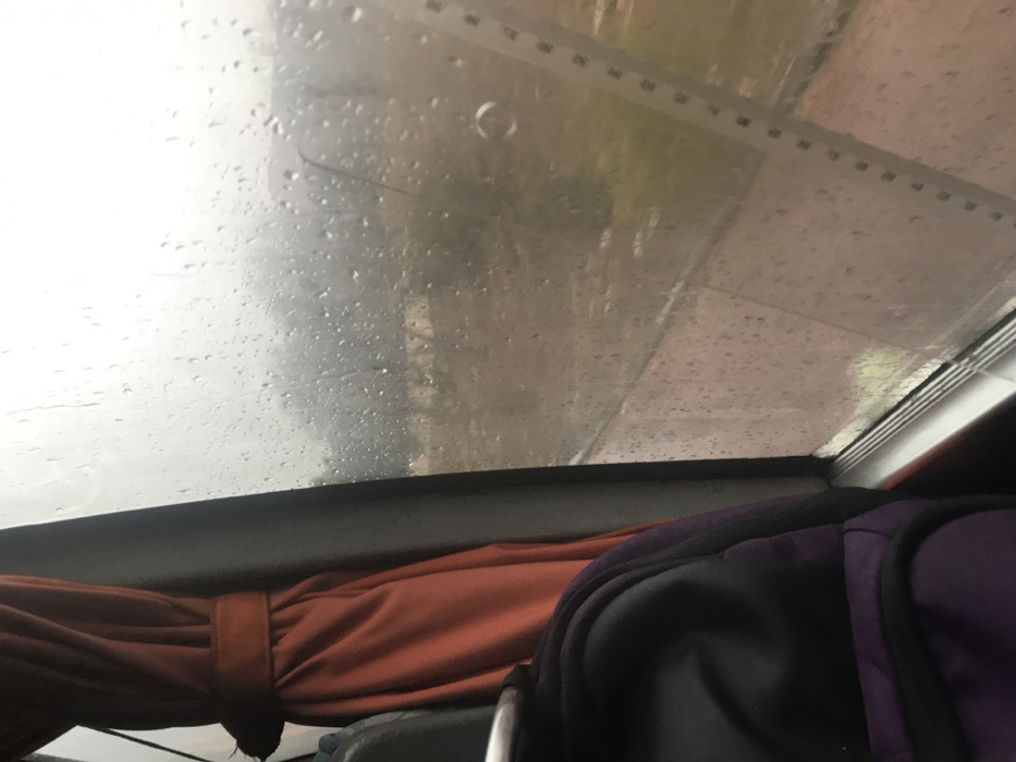 The image appears to be taken from inside a vehicle on a rainy day. Raindrops cover the window, partially obscuring the view of the outside world. A linear measurement, possibly a ruler or a scale, is visible along the top edge of the window. A backpack with purple and black sections is in the foreground. Part of an orange curtain or fabric is also visible. The lighting is subdued due to the overcast weather.