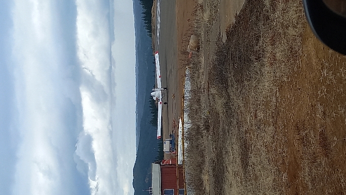 A single-engine aircraft with white wings and a red stripe sits on a gray runway, facing away from the viewer. The landscape includes rolling, tree-covered hills under a sky filled with heavy clouds. An old, red building is visible near the edge of the runway. The area surrounding the runway has dry, brown vegetation. A dark, blurry object is in the upper right corner, suggesting the photo was taken from inside a vehicle.