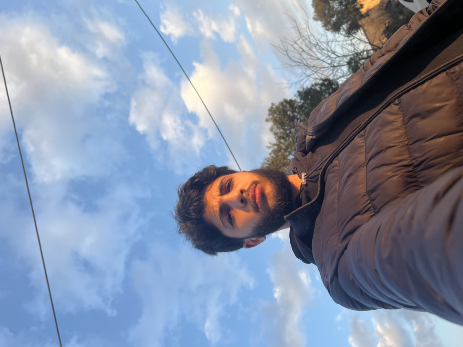 The image displays a low-angle outdoor selfie featuring a young male in At-Tall, Syria. The subject, positioned centrally, has dark hair and a beard, looking directly at the camera with a neutral expression. He is wearing a dark, possibly navy or black, puffer jacket over a dark hooded garment. His face is illuminated by warm, low-angle sunlight, highlighting his left side. The background consists of a blue sky with scattered white clouds. Two thin, dark utility lines traverse the upper portion of the frame horizontally. Bare deciduous trees are visible on the right, while green-foliaged trees are present on the left. A light-colored building or structure is partially visible in the distant background on the right.