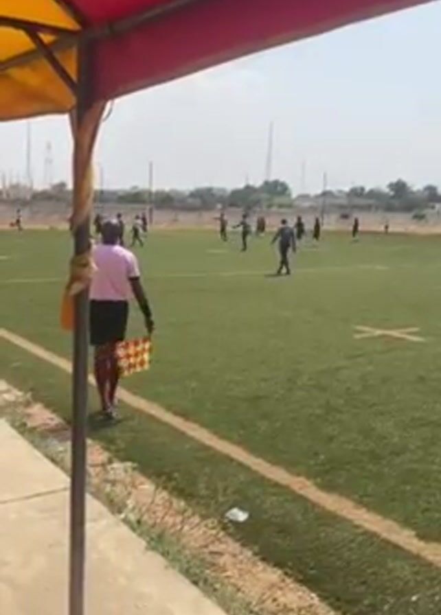 soccer game in progress on a green field. Several players wearing black are visible. An official in a pink shirt and black shorts is standing on the side of the field with a yellow and red flag. A structure with a red and yellow roof provides a partial view of the game. The sky is bright and clear. Buildings and towers are visible in the distance. The camera moves slightly to follow the action on the field.