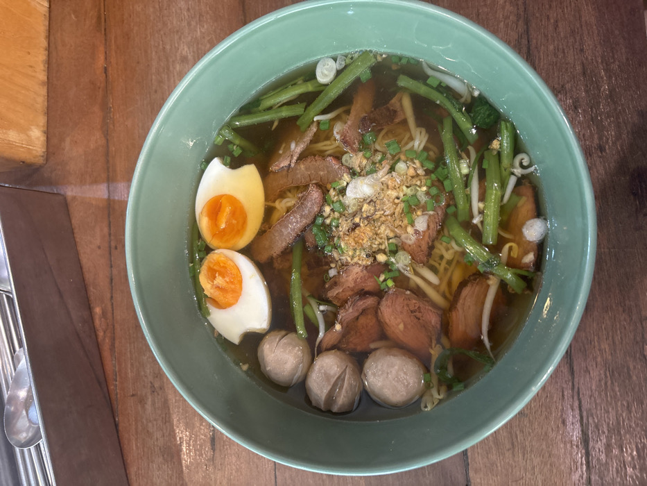A teal-colored ceramic bowl of noodle soup is centrally presented on a dark wooden table with visible grain. The soup contains thin, light-colored noodles submerged in a clear, dark brown broth. Ingredients include multiple slices of dark brown meat, three greyish-brown meatballs, and two halved hard-boiled eggs displaying vibrant orange-yellow yolks. Green vegetables, appearing to be water spinach or similar, along with bean sprouts and chopped green onions, are distributed throughout the bowl. A sprinkle of what appears to be crispy fried garlic or shallots garnishes the center. In the upper left background, a stainless steel container holds multiple metallic spoons and possibly chopsticks. The scene is located in Tambon Ao Nang, Thailand.
