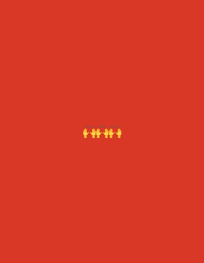 - "The image is a solid red background with a row of six yellow emoji hands raised in the air, with two fingers extended from each hand" by FM-n1nyO2, licensed under CC BY 4.0
