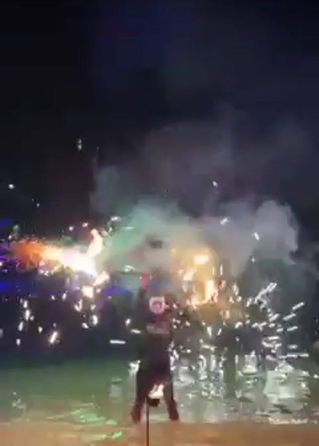 firework display at night. Sparks erupt around a central column of fire, with accompanying smoke. Blue laser lights are also visible, adding to the spectacle. In the background, there appears to be an indistinct ground or surface, and some distant blue lights add depth to the scene. The overall atmosphere is celebratory, suggested by the sounds of excitement in the background.