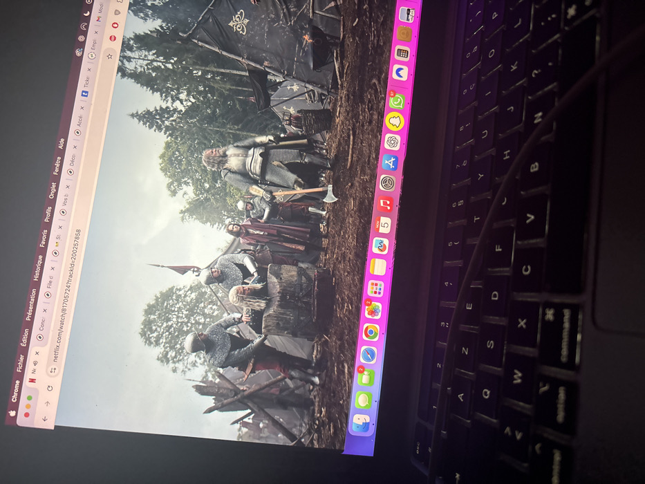 A MacBook laptop, physically located in Maisons-Alfort, France, displays a full-screen video from Netflix via the Chrome browser