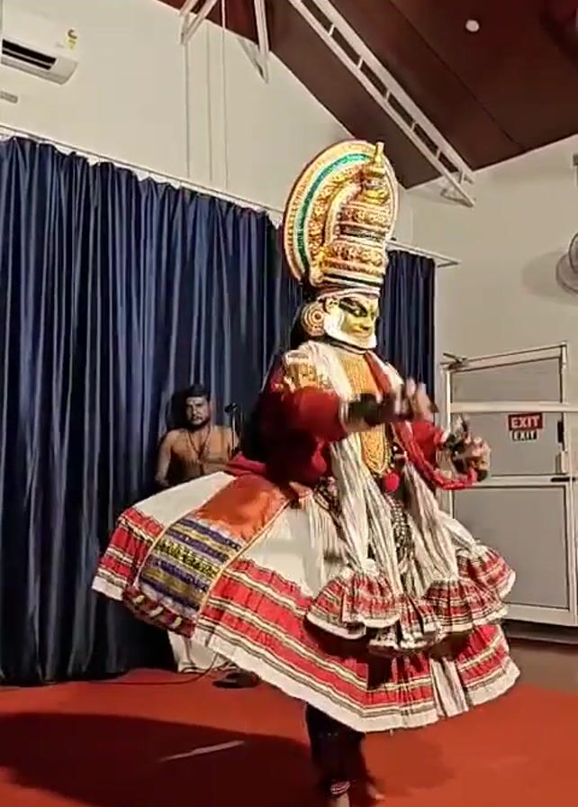 A dancer in full costume performs on a red stage in front of a curtain. The dancer wears a large, ornate headdress, a mask, a red top, and a white skirt with red and black trim. They hold a sword-like prop in their right hand. To the left of the stage, a man in a traditional Indian outfit is singing into a microphone. The background includes a wall, ceiling, an air conditioner, and an exit sign.