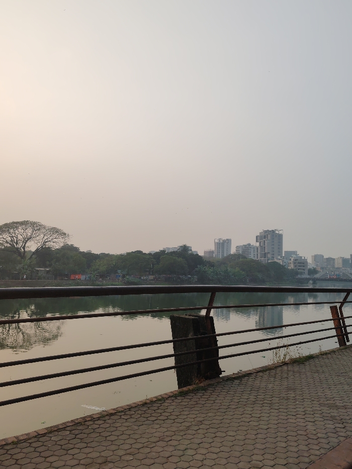The image depicts a panoramic view of Hatirjheel Lake in Dhaka, Bangladesh. The scene is observed from a paved walkway, composed of hexagonal reddish-brown pavers, visible in the bottom right quadrant. A dark metal railing with multiple horizontal bars, supported by a prominent dark concrete post and other metal uprights, runs diagonally across the midground, separating the walkway from the lake. The lake's surface is calm, exhibiting a greenish-brown tint, and faintly reflects the hazy sky and distant structures. Across the lake, the opposing bank features dense green vegetation, including a large, wide-canopied tree on the far left. Informal dwellings or structures, characterized by colored tarpaulins and fabrics, are visible nestled among the trees along the water's edge. Further to the right along the distant shoreline, a cluster of modern, multi-story buildings with varied architectural designs forms an urban skyline above the tree line. The sky overhead is a uniform light grey, indicating hazy or overcast conditions, and occupies the upper two-thirds of the frame. No individuals are visible, and no specific actions or interactions are depicted.