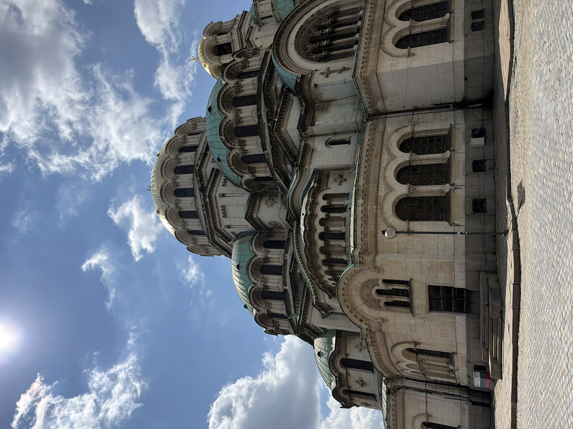 portion of the Saint Alexander Nevsky Cathedral in Sofia, Bulgaria. The structure's architecture includes domes with a distinctive greenish hue and a golden dome. The walls are detailed with arched windows and ornate carvings. The foreground includes a section of stone pavement. The sky above is partly cloudy. The sun shines brightly to the left of the frame.