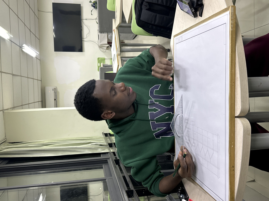 An individual is depicted in a classroom or study hall environment within the city of Jiangjin, China. The subject is a male with a dark complexion and short, dark hair, wearing a dark green hooded sweatshirt featuring "NYC" in white lettering on the chest. He is seated at a light-colored desk, intently focused on a large white sheet of paper affixed to a drawing board. His left hand holds a green pencil and a transparent protractor/set square, which rests on the paper over a technical drawing resembling a building facade or staircase design. His right index finger is extended, pointing or resting on the paper to the right of the drawing. To the immediate right of the drawing board, a black backpack rests on an adjacent chair, and a smartphone in a black case is positioned on the desk. The background shows a room with light-colored walls and a ceiling fitted with multiple fluorescent light fixtures. An air conditioning unit is mounted high on a wall. A large black flat-screen television is visible mounted on the far wall, with cables descending from it. To the left, large windows with dark frames are partially obscured by light-colored curtains. Several other light-colored desks with green chairs are visible further back in the room, indicating a multi-person study or classroom setting.