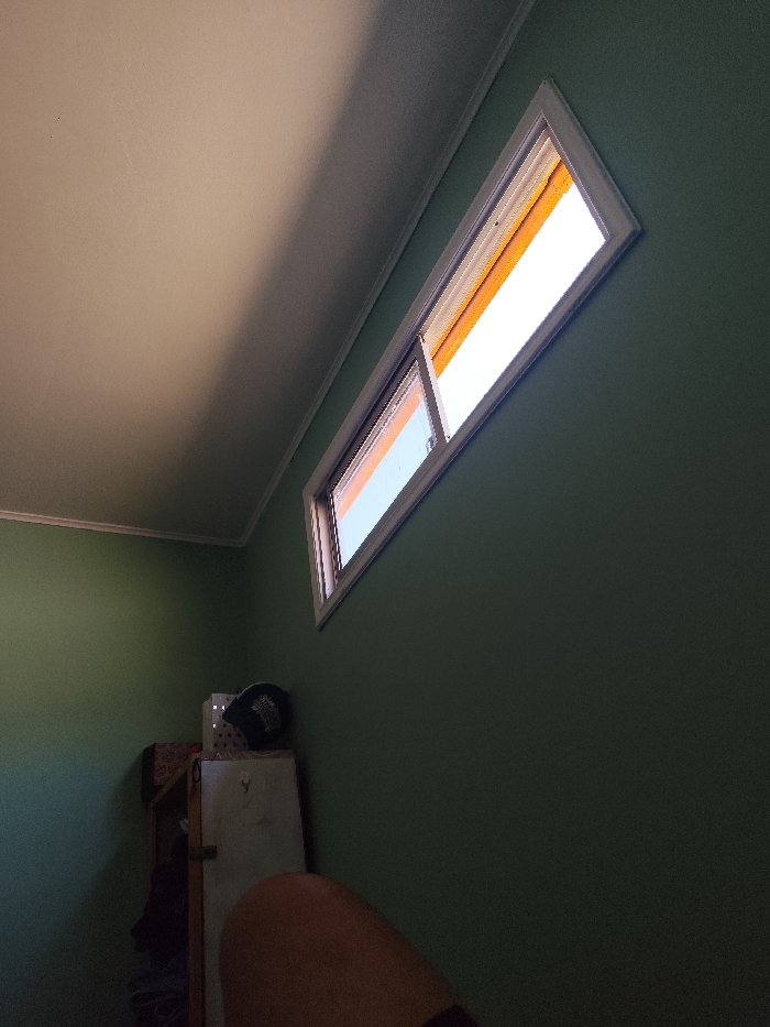 A dimly lit room with green walls features a narrow window positioned high on the wall, revealing sunlight and what appears to be an orange-colored blind. Underneath the window, a shelf holds items, including a white box with a black cap on top. A person's knee and thigh are visible in the foreground, suggesting they are seated. The ceiling is white and appears to be casting a shadow across the room.