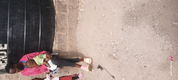 The scene depicts an outdoor setting in an informal or peri-urban environment consistent with parts of Nairobi, Kenya. A large, ribbed, black polyethylene water tank with the white text "WENDE" visible on its upper surface is centrally positioned, resting on a grey concrete block foundation. An individual with dark skin, wearing a pink hooded jacket over a blue garment, dark trousers, and light pink slide sandals, is seated on this concrete foundation, leaning against the water tank. This individual holds an infant, dressed in a light green top and white undergarment, on their lap. The seated individual's head is turned towards the left of the frame, displaying a faint smile. Partially visible to the left of the seated individual is a young child, wearing a red skirt and pink shoes, with an arm extended towards the lap area of the seated individual. The ground is composed of dry, light brown soil mixed with small rocks and gravel. A black, elongated, amorphous object lies on the ground in the lower-left foreground. A specific address or landmark location within Nairobi cannot be determined solely from the visual evidence presented.
