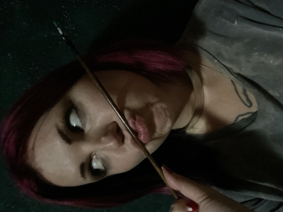 A woman with dark hair and piercing white eyes holds a thin, wooden object to her lips. She is wearing a grey shirt and a silver collar. Part of a tattoo is visible on her chest. The background appears dark, possibly a wall or floor. The image is taken from a low angle and is slightly blurry. Her fingernails are painted red with a white dot on one.