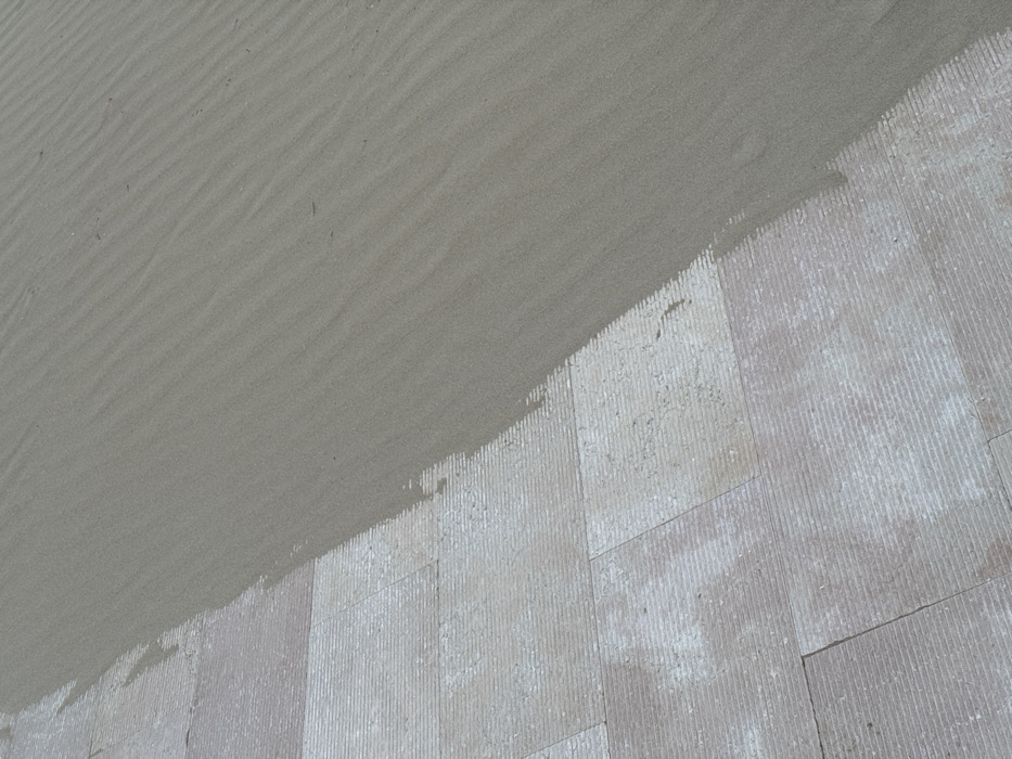 The image displays an outdoor ground-level scene in Grottammare, Italy, depicting the transition between a paved surface and a sandy area. The lower-left portion features light-colored, rectangular paving stones with visible parallel striations on their surface, possibly indicating a textured finish or wear. These stones are arranged in a regular pattern, and some exhibit areas of lighter discoloration. The upper-right portion consists of fine-grained, light brown-gray sand. The sand displays distinct, parallel ripple patterns, oriented diagonally across the frame, consistent with wind or water movement. Scattered small, dark specks of debris are visible within the sand. An irregular, undulating edge delineates the boundary, with sand partially encroaching onto the paved surface. No people, animals, or other significant objects are present in the scene.