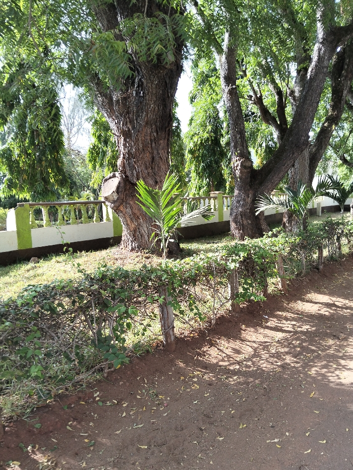 Mature trees dominate the landscape with a fence made of short wooden posts and intertwined shrubbery in the foreground. A white concrete barrier with green accents sits further back, behind the trees. Smaller palm plants grow at the base of some trees. The ground is dirt covered with fallen leaves and dappled with shadows. The foliage of the trees creates a dense canopy overhead.