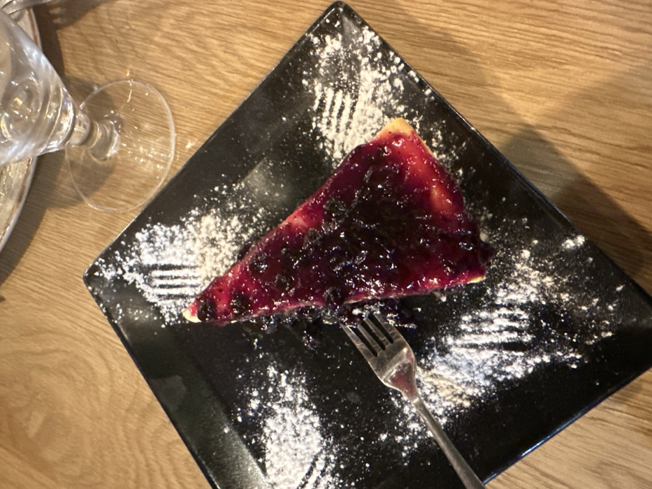 - "A triangular slice of dessert, likely cheesecake, topped with a dark, reddish-purple berry compote or sauce, rests on a black rectangular plate" by FM-iMne13, licensed under CC BY 4.0