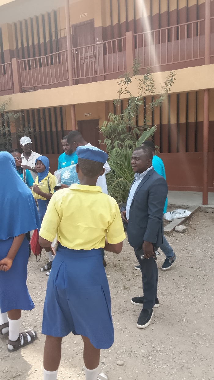 The image depicts a group of people standing in front of a building located in Street, Nigeria, at coordinates 6