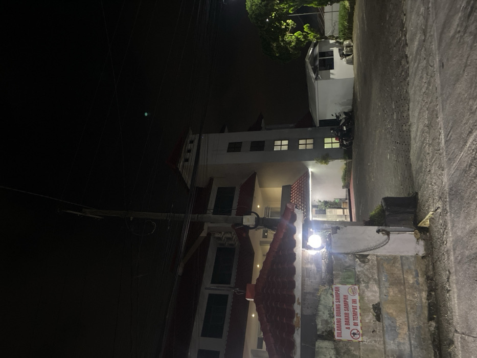 The image displays a nighttime exterior view of a multi-story building in Pacet, Indonesia