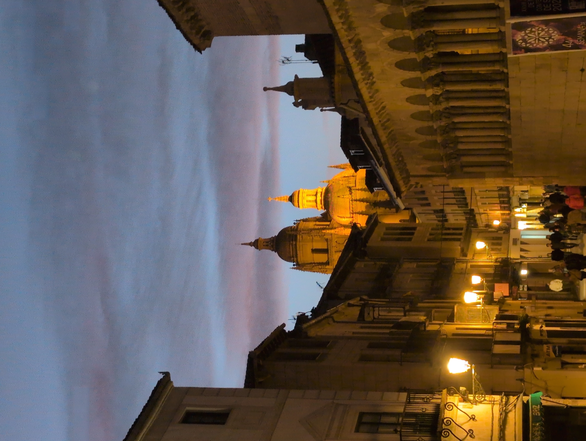 street scene at night in Segovia, Spain. The sky is a blend of blue and pink hues, indicative of dusk. In the middle ground, the illuminated dome of the Segovia Cathedral is visible. The surrounding buildings are lit with warm-toned streetlights, creating a contrast with the cooler tones of the sky. People are walking along the street. The architecture is old European, with balconies and ornate details.