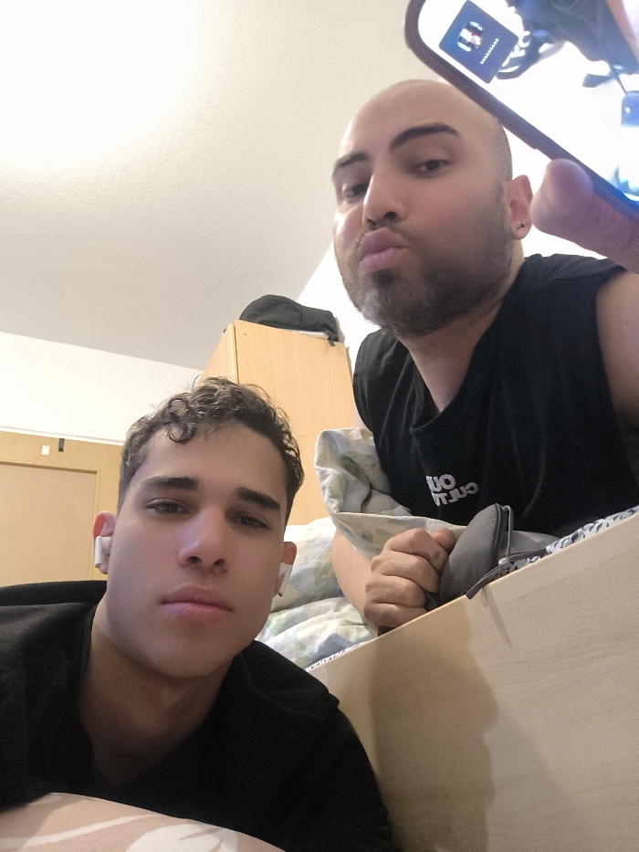 two males in a residential room. In the foreground, a young male with short, curly dark hair and light skin wears a dark shirt and white wireless earbuds. He looks directly at the camera with a neutral expression. Behind and to the right, a bald male with a short beard and light skin wears a dark sleeveless shirt and a dark stud earring in his left ear. He holds a smartphone with his right hand, pointing it towards the subjects, and has a puckered lip expression. Both individuals are positioned within a space featuring light-colored wooden furniture, including a bed frame and a wardrobe, upon which a dark bag rests. Light-colored patterned bedding is visible around them. The room has plain white walls and ceiling, illuminated by overhead lighting. The specific location within Dresden, Germany, cannot be ascertained from the visual evidence in the image.