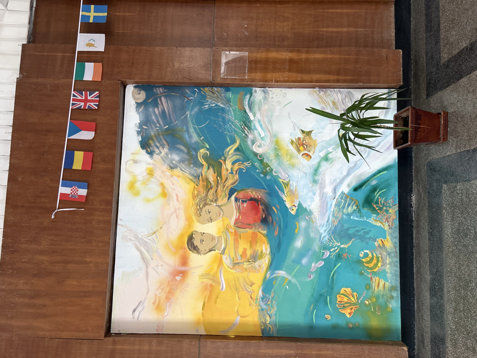 An indoor scene in Shumen, Bulgaria, features a large, vibrant mural integrated into a dark reddish-brown wood-paneled wall. The mural depicts two central human figures: a young male on the left in a striped yellow and orange shirt, and a young female on the right in a red top, both positioned against a background of dynamic yellow, orange, blue, and white swirls. The upper left of the mural is dominated by warm yellow and orange hues, transitioning to swirling blues, aquas, and whites, suggestive of water and sky. The lower half illustrates an aquatic environment with stylized yellow and orange fish, seashells, and various underwater flora. Above the mural, strung horizontally, are seven small national flags: Croatia, Romania, Czech Republic, the United Kingdom, Ireland, Cyprus, and Sweden, from left to right. On the floor in front of the lower right section of the mural, a single potted plant with slender green leaves stands in a square, reddish-brown ceramic pot with a matching saucer. The floor consists of large, dark grey square tiles with lighter grey lines, and a black strip borders the base of the mural.