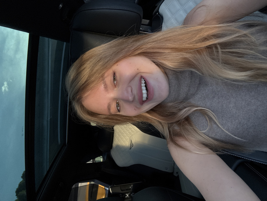 A young woman with long, blonde hair and green eyes is seen smiling broadly inside a car