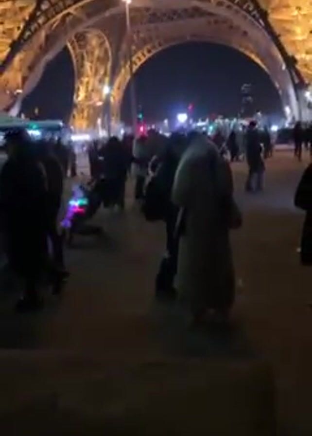 The video pans upward to reveal the Eiffel Tower at night. The tower is illuminated in gold. A crowd of people is gathered in front of the tower. Some people are walking around. A small bus is visible in front of the tower.