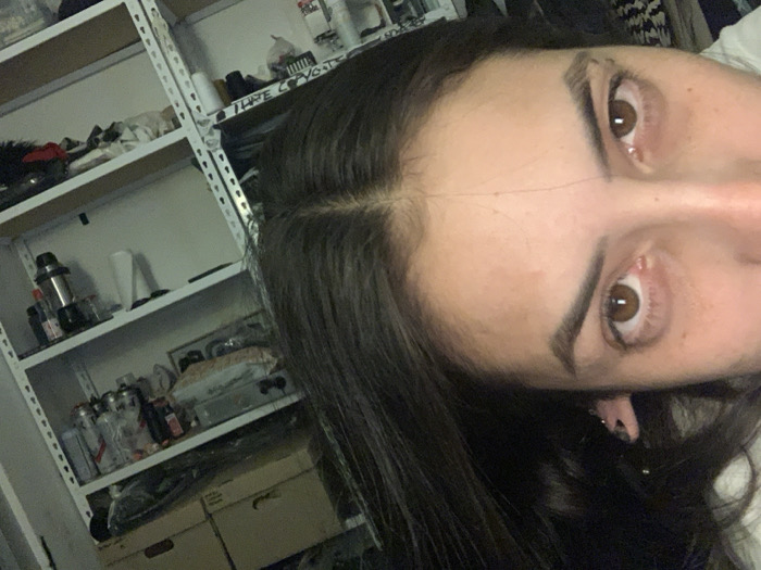 A close-up image focuses on a woman's face, slightly tilted to the right. Her eyes are brown, and her eyebrows are groomed. Dark hair frames her face, and the parting is visible at the top of her head. In the background, a white metal shelving unit is partially visible, filled with various items including cans, boxes, and bottles. Some writing can be seen on the shelf, though it is partially obscured. The overall lighting in the room is subdued.
